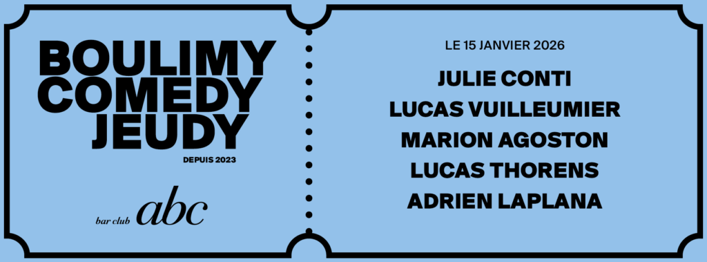 Afin de vous les présenter, le théâtre Boulimie crée le BoulimyComedyJeudy – un rendez-vous mensuel de standup à l’ABC, club parfait pour y proposer des plateaux du genre !